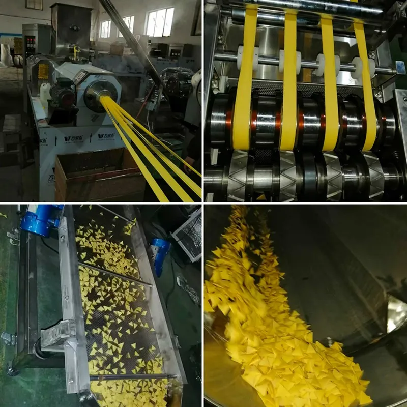 Equipment involved: Mixer; Spiral conveyor; Double screw extruder; Cutter; Fryer machine; Flavor mixing drum; Automatic packing machine.